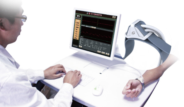 中醫(yī)脈象診斷系統(tǒng):利用計算機(jī),通過袖帶式傳感器,傳感器自身重量≤50克,在橈動脈寸,關(guān),尺三個部位檢測脈象信號,模仿中醫(yī)醫(yī)師指法,(傳感器Φ8圓形)更準(zhǔn)確的按照中醫(yī)舉、按、尋的診脈過程,浮、中、沉散布全自動氣體加壓取脈,采集八個不同壓力段的脈象波形自助選擇佳壓力波形,并將脈象的位,數(shù),形,勢和脈圖的各項參數(shù)自動分析,以判定脈象信息,用于臨床脈象檢測。